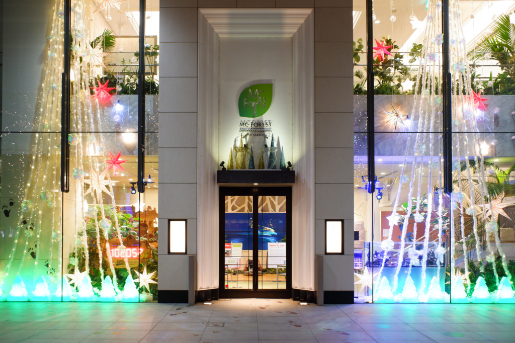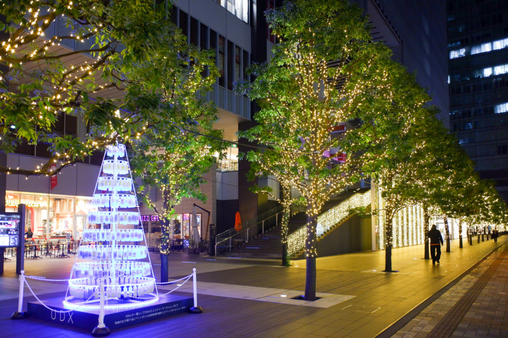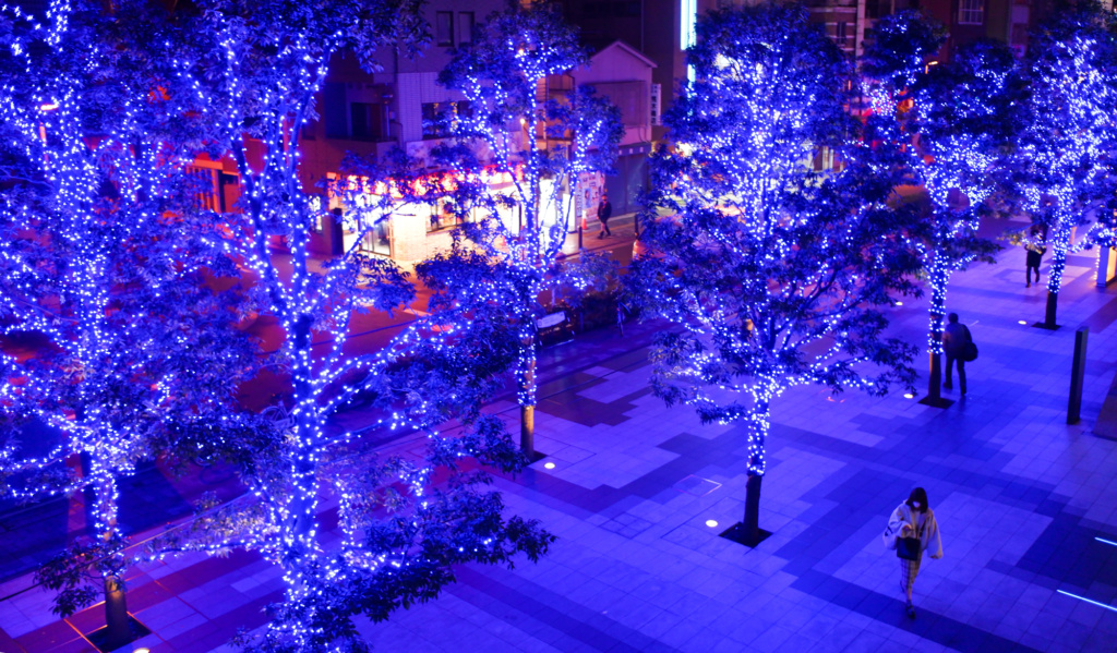駅前の街路樹にも緑の明かりが灯り、