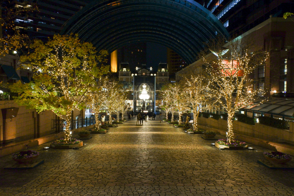 LEDで装飾されたツリーの並木道の先で