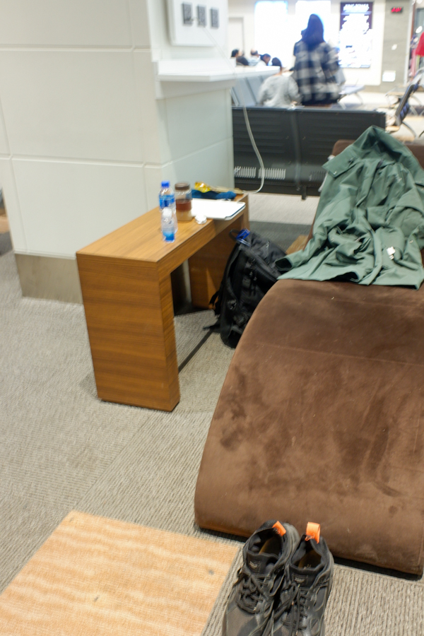 どんな空港なのか下調べしてこなかったので不安ではあったが、施設は比較的新しく、無料のWi-Fiは簡単に接続できるし、幸いなことに楽な体勢で横になれる寝そべりベンチがある。さらに運が良いことに充電ブースの横が空席だ。よって、そこに陣取り一番近いコンセントに充電器を挿入。すぐにサイドデスクを私物で占拠し、コートをブランケット代わりに広げて、ソッコーでテリトリー化に成功する。